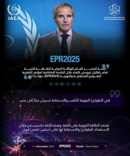خلال كلمته في حفل الإفتتاح للمؤتمر الدولي للتأهب والإستجابة للطوارئ النووية والإشعاعية مدير عام الوكالة الدولية للطاقة الذرية رافائيل غروسي يؤكد أهمية تعزيز جاهزية منظومة الطوارئ والاستجابة المبنة على أسس علمية.