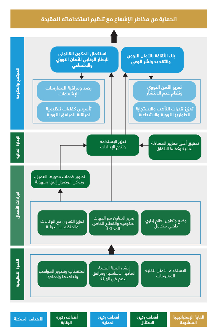 عملت الهيئة على تنفيذ خطتها الاستراتيجية التأسيسية للسنوات الثلاث (2021-2023م) لتحقيق الغاية الاستراتيجية "الحماية من أخطار الإشعاع المؤين مع تنظيم استخداماته المفيدة". وتتضمن الاستراتيجية فئتين من الأهداف الاستراتيجية التي تؤدي إلى تحقيق هذه الغاية.